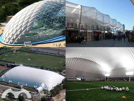 忠盛达的气承式膜结构建筑膜材造价低廉,双层膜比传统的轻体建筑复合保温板的价格低约30%,但仅比单层膜高出30%左右。由于膜建筑屋面重量仅为常规钢质屋面的1/30,这同时降低了墙体和基础的造价。如果遇到地震等一些突发情况也会将人员伤亡及财产损失降到最低.涂有PVDF的膜材具有较高的热反射率和散热率,是国内外膜建筑界推荐使用的最佳节能环保材料。采用的中空保温系统,将膜建筑珠联璧合,能耗仅为传统建筑的1/10-1/4,总节能在80%以上。普通膜材对光的透射率约为5%。半透光膜对自然光的透射率可达25%-30%,白天可利用自然光,夜晚在内部照明的作用下,发出自然柔和的光辉,令人陶醉,形成景观效应。同时忠盛达膜结构建筑还配有数十项国家专利系统如:钢网系统 照明系统 移动配重 智能风控系统 基础连接系统 环境处理系统 门禁系统 可移动膜结构空间 温控系统 控制系统......双配置供风系统机电设备,功能齐备,在最恶劣的情况下也能保证建筑的正常运转并有计算机跟踪记录显示,自动存储运行、运转数据实现数据可视化。